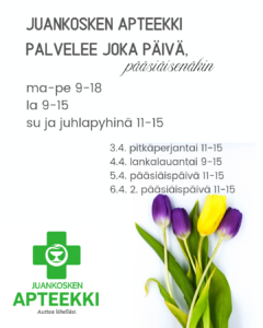 Valitettavasti emme ole vielä saaneet rokotuspalvelullemme lupaa – moni muukin apteekki odottaa sitä tällä hetkellä, joten odotus on vähän venynyt. Mutta huhtikuun puoliväli on nyt meillä vahvana odotuksessa! Odotamme innolla pääsevämme käyttämään uutta osaamistamme, ja rokotuksia odottavia on jo jonossa. Tämä on todella mukava lähtökohta toiminnalle! Myös kylän uusi odotettu KoskenKiska on juuri ilmoittanut avaavansa ovet pääsiäiseksi eli tänään kiirastorstaina – Eli erittäin positiivisin mielin vaan kevättä ja pääsiäistä kohti! Niin ja: me palvelemme jatkossa lauantaisin tunnin pidempään eli 9-15!